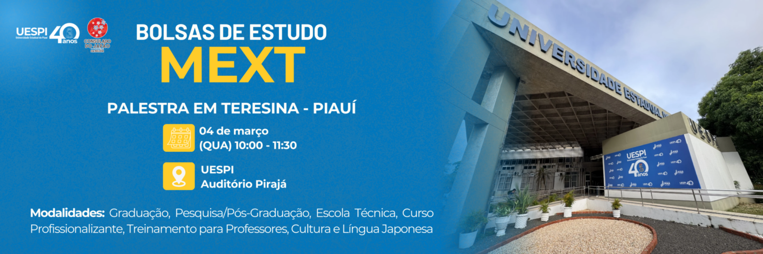 O Consulado do Japão em Belém realizará, no dia 4 de março, uma palestra na Universidade Estadual do Piauí (Uespi) para apresentar as bolsas de estudos do governo japonês, por meio do Ministério da Educação, Cultura, Esporte, Ciência e Tecnologia (MEXT). A iniciativa é voltada a estudantes e professores interessados em realizar formação acadêmica no Japão com custeio integral.