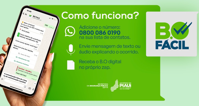 BO Fácil – ferramenta de registro de ocorrências por WhatsApp que acumula mais de 50 mil registros em cinco meses de funcionamento. Para acessar, basta adicionar o número 0800 086 0190 na sua agenda, enviar uma mensagem (texto ou áudio) para iniciar o atendimento com a inteligência artificial, descrevendo o ocorrido, e seguir as instruções para registrar o BO, receber o PDF, fazer denúncias ou acionar emergências.